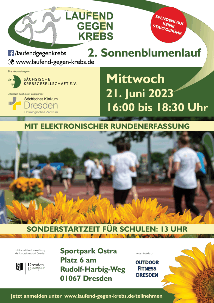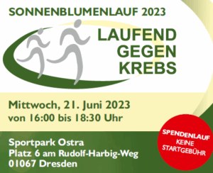 Der Lauf am 21.Juni 2023 steht unter dem Motto Sonnenblumenlauf. Die Sonnenblume steht als Symbol für Lebenswille und Lebensfreude. Das Prinzip: Man läuft einzeln oder im Team so viel, wie man will oder kann. Für jede Runde zahlt ein vom Läufer gewonnener Sponsor (oder er selbst) einen Beitrag. Mit diese Spenden werden Projekte unterstützt wie – die Sporttherapie von Sonnenstrahl e. V. Dresden, Informationspunkte der Sächsische Krebsgesellschaft im ländlichen Raum, oder Wohngemeinschaftsprojekte zur Schaffung von Wohngemeinschaft für Betroffene und Angehörige in einer altersgerechten Wohnumgebung.