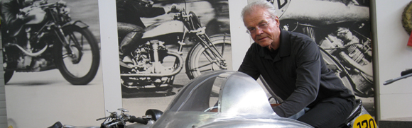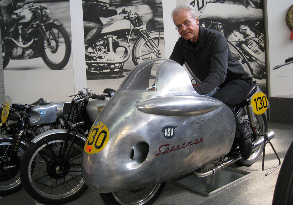 Foto : Der zweifache Motorrad-Weltmeister Dieter Braun auf der NSU Sportmax im Rennsportmuseum am Hockenheimring