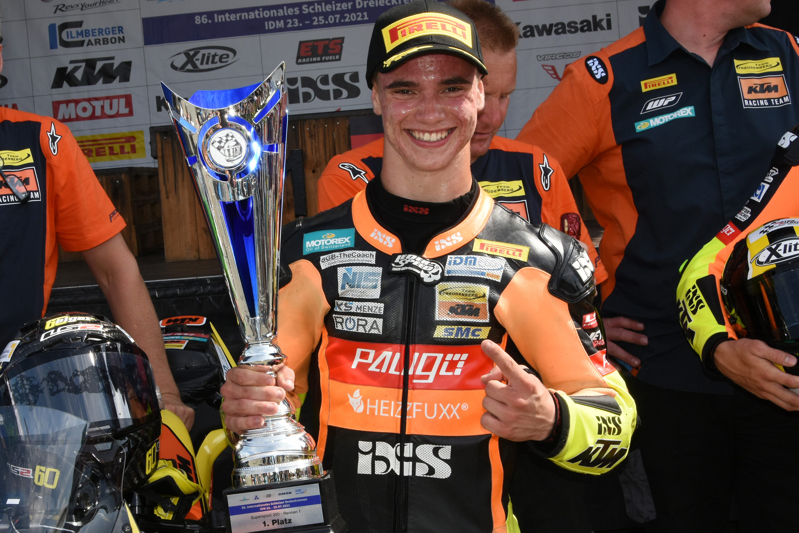 Auch im zweiten Rennen setzte sich Geiger gleich ab und siegte diesmal mit 2,813 Sekunden vor dem amtierenden Meister Lennox Lehmann (KTM) aus Dresden, der im ersten Lauf Dritter war. Nach dem Doppelsieg strahlte Geiger: „Ich bin megahappy und ein Riesendank an mein ganzes Team. Ich habe gleich zu Anfang gepusht und hatte dann einen Puffer. Es war ein megageiles Rennen und wieder vor den Fans zu fahren ist grandios. Ich bin das erste Mal in Schleiz und habe mich gleich in den Kurs verliebt.“