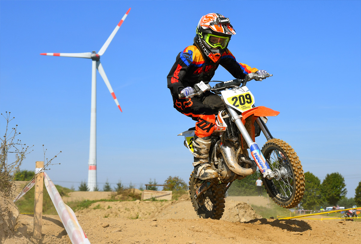 Nachmittags ging es dann auf der um einige Herausforderungen reicheren Strecke noch flotter zu Sache, als die Youngsters für sechs bzw. acht Runden ihren Maschinen 85 ccm und 125 ccm die Sporen gaben. Besonders die Größten, die schon teils auf einige Jahre Erfahrung im ADAC Enduro Jugend Cup bauen können, drehten mächtig am Gasgriff. Entsprechend spannend gestaltete sich der Kampf um den Tagessieg, in welchem gleich fünf Fahrer involviert waren. Am Ende setzte sich Lokalmatador Sky Dombrowski aus Marienberg durch, der damit erstmalig sein Heimrennen gewinnen konnte und sich zudem an die Tabellenspitze setzt. Der bisherig führende Leon Schott (Großrückerswalde) musste sich mit Rang fünf begnügen. Damit musste er Oskar Müller (Lossatal), Lucien Weißwange (Freiberg), der im letzten Test durch einen Sturz noch einen Platz einbüßte, und Colin Lang (Reichenbach) den Vortritt lassen.