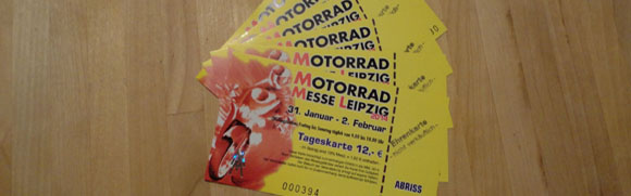Fünf mal zwei Freikarten kann Christoph – hier – für die Leipziger Motorradmesse verlosen. Die Tickets hat er zwar noch nicht, sie sind aber per Post unterwegs nach Dresden. “Ist grad etwas hektisch hier… 10 Karten gehen per Post heute raus”, hat ihm am Freitag Twin-Chef Thomas Deitenbach versichert.