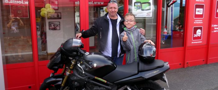 Schon während der Ausfahrt war mir klar: Das soll Florian nie wieder passieren. Ich hatte mir vorgenommen, ihm einen eigenen Motorradhelm zu schenken. Dabei hätte mir klar sein müssen, dass auf große Köpfe eben nur tolle Helme passen.