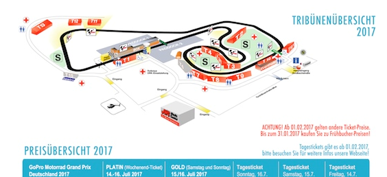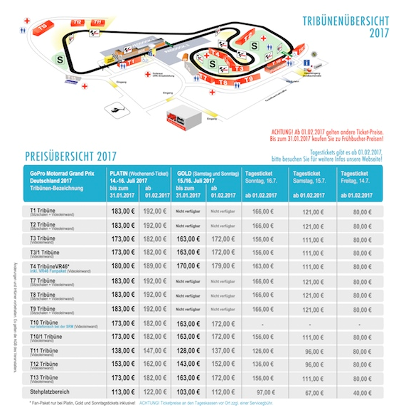 Zur Sicherung des Motorrad Grand Prix auf dem Sachsenring für die nächsten fünf Jahre war eine Erhöhung der Ticketpreise leider unumgänglich. „Es gibt schon sehr viele Partner, welche die SRM seit Anbeginn tatkräftig unterstützen und denen gebührt unser aufrichtiger Dank. Leider gibt es aber noch immer einige, nicht unerheblich wenige, hiesige Unternehmen, die sich zwar an den Früchten des Motorrad Grand Prix Deutschland laben, aber leider nichts zur Unterstützung des Erhaltes der Veranstaltung beitragen“, so Wolfgang Streubel, Geschäftsführer der SRM GmbH. „Die SRM ist also gezwungen die Veranstaltung nicht nur mit Hilfe unserer Partner und Sponsoren, sondern auch durch die Erhöhung der Ticketpreise auf solide Beine zu stellen.“Bitte beachten Sie, dass es bis zum 31.01.2017 die Tickets zum Frühbucher-Tarif gibt. Ab 01.02.2017 gelten die Preise wie in der Preisübersicht, in der jeweiligen rechten Tabellenspalte angegeben.