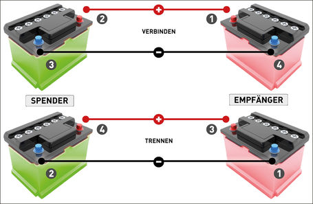 Die Zündungen beider Fahrzeuge sind zunächst ausgeschaltet. Zuerst wird die Polzange des roten Pluskabels mit dem Pluspol der Maschine mit Startschwierigkeiten, also dem »Empfängerfahrzeug« verbunden, danach mit dem Pluspol des Spenderfahrzeugs.
