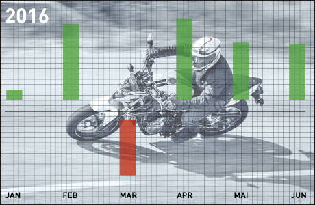 In Deutschland wurden im ersten Halbjahr 100.047 neue Motorräder und Kraftroller zugelassen. Das sind knapp 4000 Einheiten (+4,1 %) mehr als in den ersten sechs Monaten des Vorjahres. Im Juni stiegen die Verkaufszahlen gegenüber dem Vergleichsmonat 2015 nach Angaben des Industrieverbands Motorrad (IVM) sogar um 9,4 Prozent auf 19.410 Einheiten.