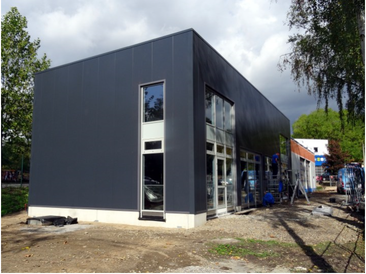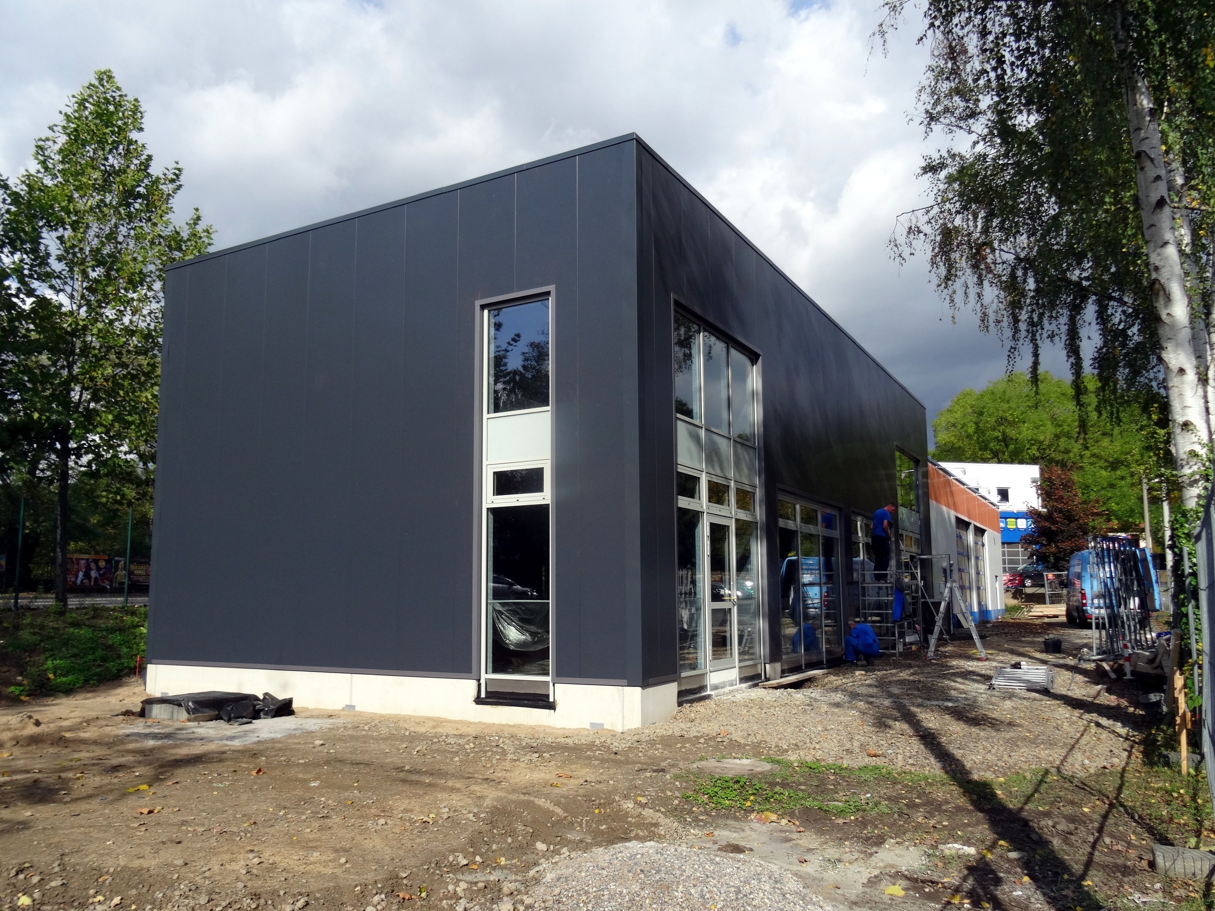 Letzte Arbeiten an der Fassade des Neubaus, links führt die Hansastraße vorbei.